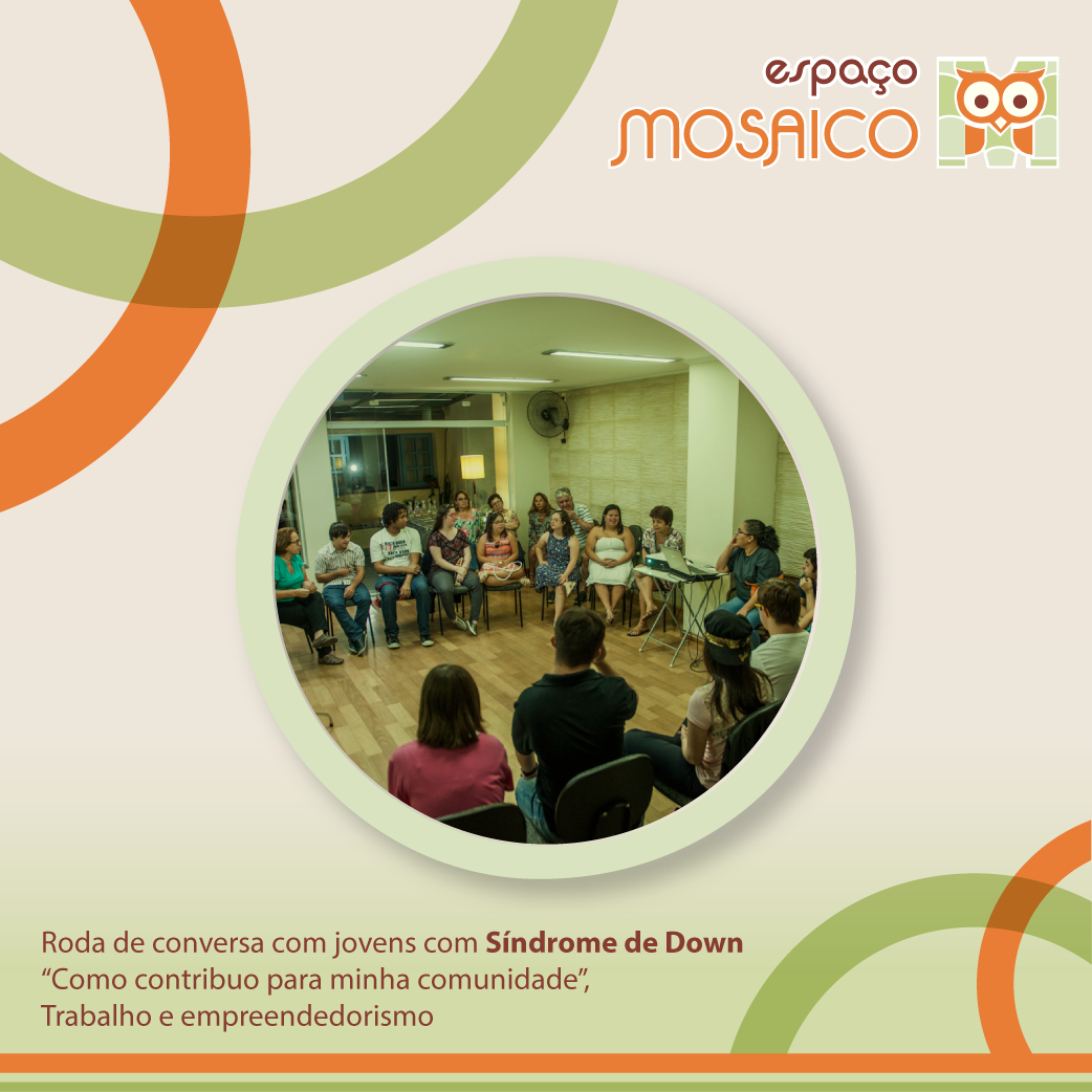 O Espaço Mosaico e o In Movimento Inclusivo apresentaram-se e posteriormente os jovens falaram de suas experiências no trabalho, escola, faculdade. Foi uma uma grande oportunidade de compartilhar um pouco das experiências pessoais e coletivas de cada um, os jovens puderam falar sobre como se sentiam diante da sociedade, as principais dificuldades e facilidades que encontraram nos seus caminhos e o apoio que receberam de parceiros, da famílias e/ou de instituições. Que possamos criar mais espaços para compartilhar e trocar nossas experiências no dia-a-dia!