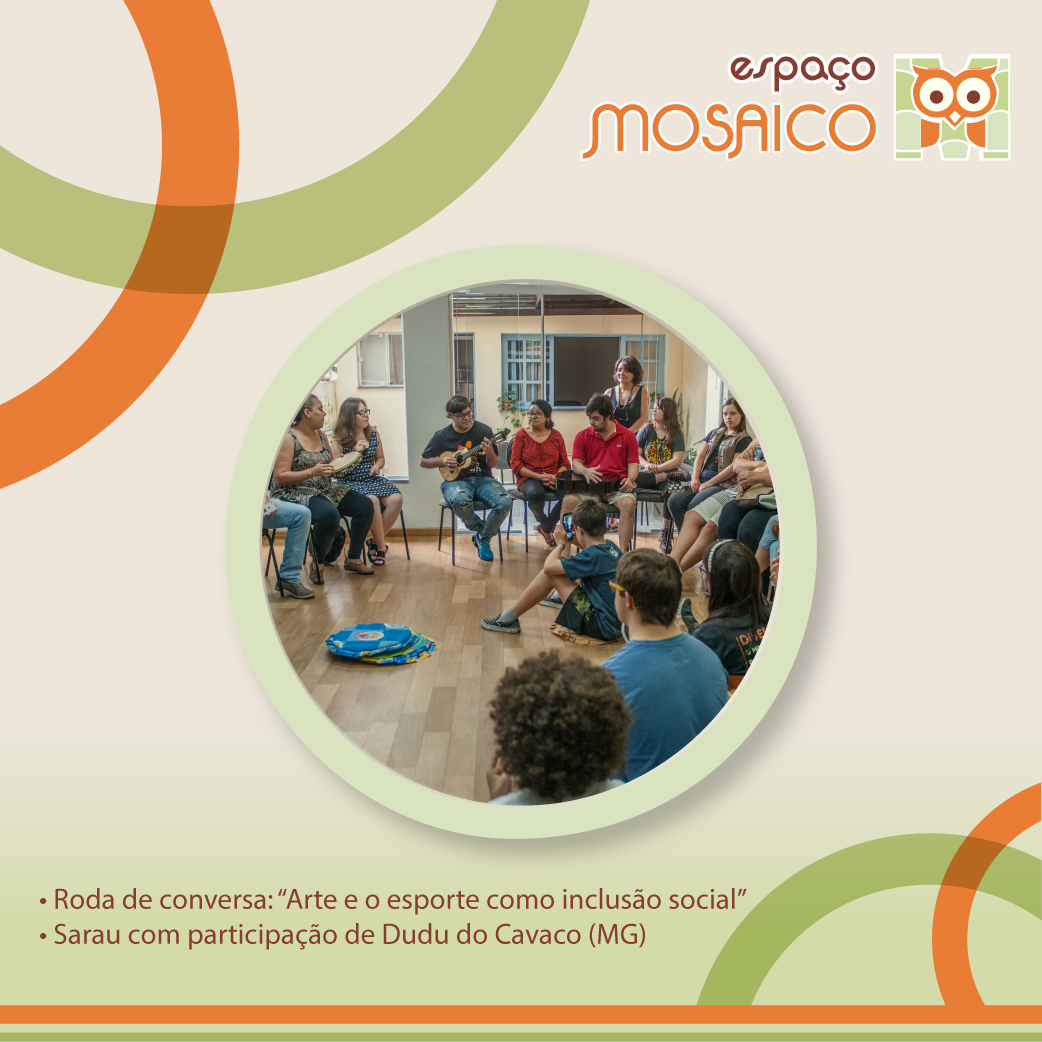 Para celebrar a última atividade da Semana Internacional da Síndrome de Down, no dia 23 de março, recebemos, no Espaço Mosaico parceiros dessa caminhada em uma tarde descontraída para participar de uma roda de conversa com os jovens sobre: “Arte e o esporte como inclusão social”, e terminamos o dia com o Sarau, que contou com a participação do Dudu do Cavaco.